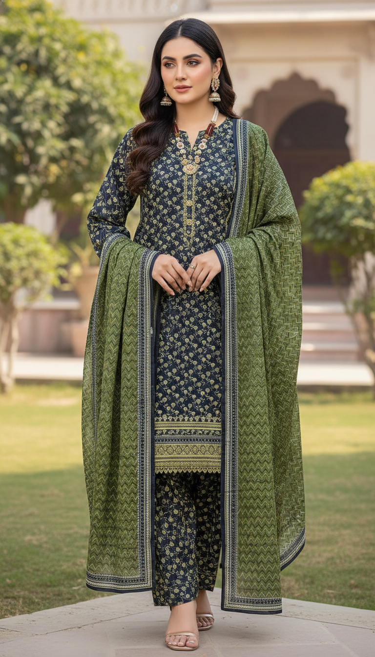 - Overall Aesthetic: Deep navy foundation with golden florals and green accents evokes heritage elegance; lightweight fabric ensures breathability, while the large dupatta provides layering and poise.