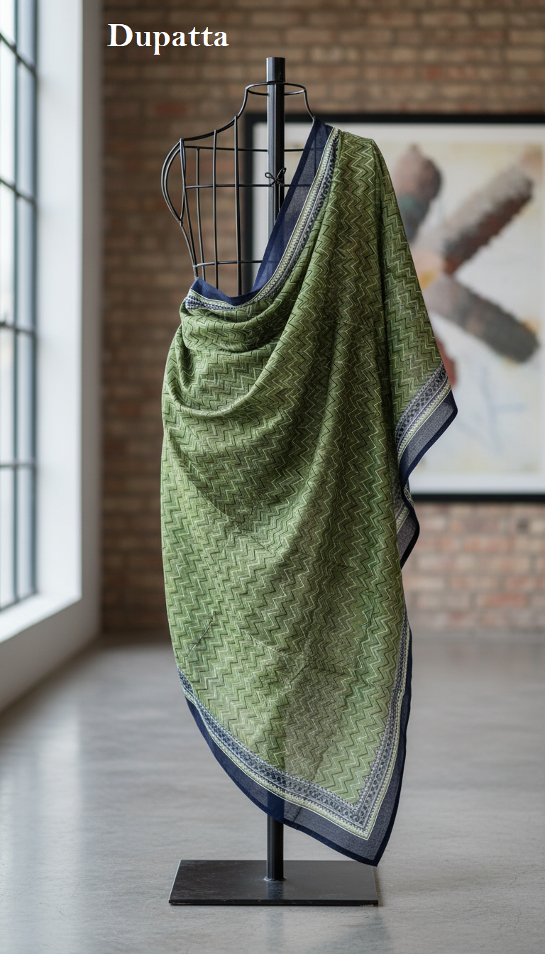 - Dupatta Contrast: Olive green base with bold zigzag or wavy patterns and wide navy-bordered edges—adds dramatic contrast and movement to the softer printed kurta.