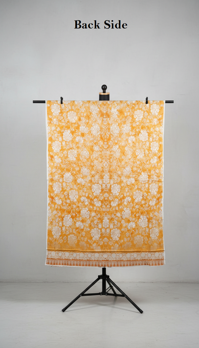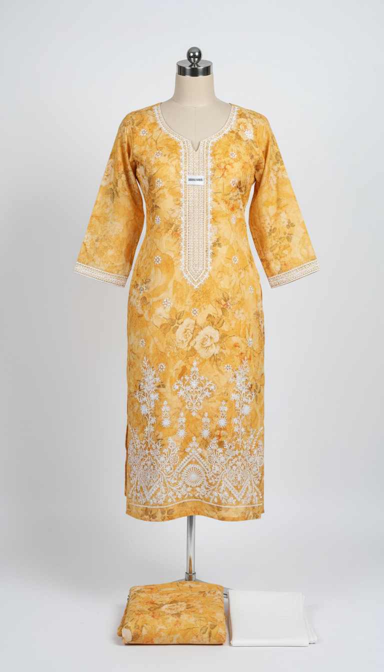 - Kameez (Tunic/Top): A straight or gently flared long kurta in a bright yet soft mustard yellow/golden yellow base. The fabric is lightweight and flowy, likely chiffon, georgette, or cotton-silk blend with a subtle sheen. It features an all-over abstract geometric and floral print in varying shades of yellow, cream, and soft orange—creating a patchwork-like effect with large leaf motifs, abstract blocks, and scattered blooms for a modern-traditional fusion. The front showcases intricate white thread embroidery (possibly zari, resham, or gota work) in a central vertical panel: delicate jaali/lattice patterns, floral medallions, paisley-inspired motifs, and hanging elements along the neckline. The round or subtle keyhole neckline is accented with fine white lace or gota detailing. The hemline has a broad white embroidered border with symmetrical floral and geometric designs, finished with a dainty white lace trim for added elegance. Full-length sleeves are printed to match the body, keeping the look cohesive.